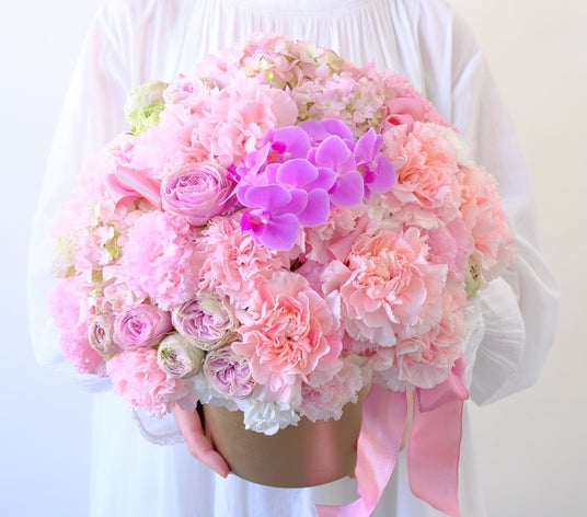 たっぷりのカーネ-ションと季節の花々に気品あふれるランの花を添えたアレンジは、モダンで都会的な中にも華やかさやふくよかさが際だつデザインです。