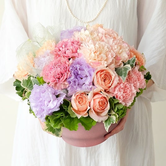 ピンクとアプリコットカラーのグラデーションに淡い紫を入れた、少し大人の雰囲気のアレンジメントです。オーガンジー素材のリボンが上品な花々とあいまって、貴婦人のドレスのようなイメージを醸し出しています。