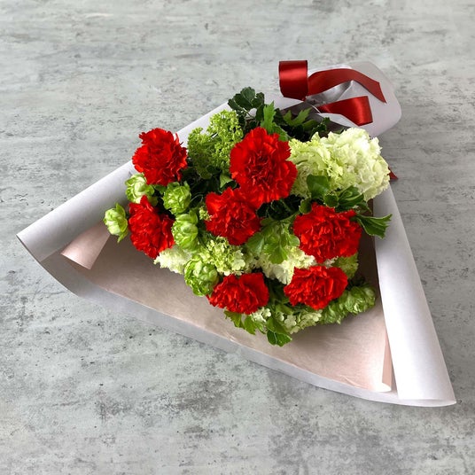 母の日を象徴する真っ赤なカーネーションとフレッシュでみずみずしいグリーンのコントラストが、元気でエネルギッシュな印象のブーケです。