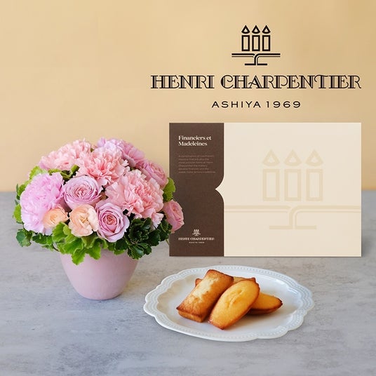 優しい色合いの生花のアレンジメントと美味しいお菓子でスイートな時間をお届けします。アンリ・シャルパンティエ一番人気の詰合せ<フィナンシェとマドレーヌ>。おいしさを求めて進化をかさねてきたフィナンシェと、創業当時から愛され続けているマドレーヌ。焼き菓子2種の詰め合わせです。