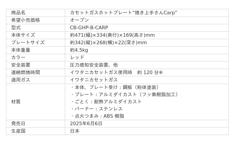岩谷産業株式会社(本社:大阪・東京、社長:間島寬、資本金:350 億円)は、プロ野球球団の「広島東洋カープ」とコラボレーションした新商品「カセットガスホットプレート“焼き上手さんCarp”」を、当社の公式オンラインショッピングサイト「イワタニアイコレクト」、直営ショップ「Iwatani Outdoor Shop BASE 」、中国・四国地方を中心としたホームセンター、大型スーパーなどで6月6日より数量限定で発売開始いたします。