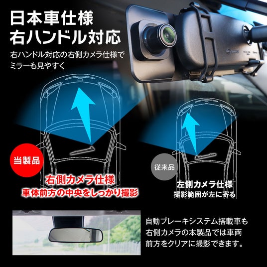 フロントカメラを右側に配置することにより、ミラーを運転席側に傾けても、レンズが大きく左側を向かず車両前方の中央を撮影可能。また自動ブレーキシステムを装着している国産車の多くは、装置が車体の中心もしくは左側に設置されているため、従来の左側カメラでは録画映像に装置が映り込んでしまうことがありますが、右カメラの本製品では従来品と比べ安全支援装置の映り込みを軽減し、車両前方をクリアに撮影できます。