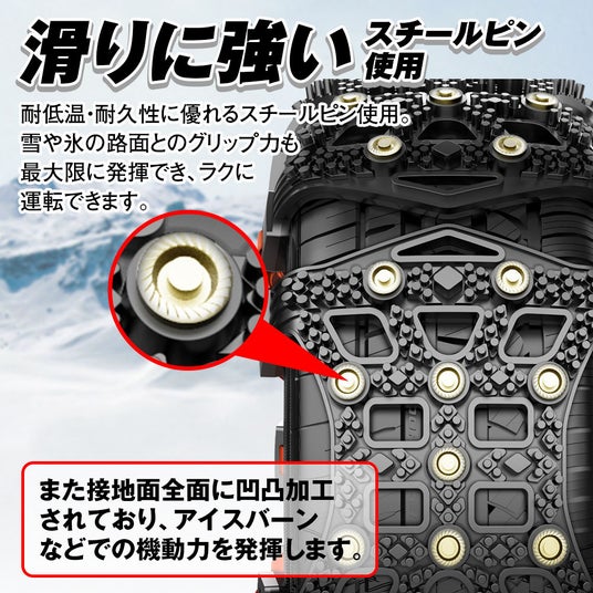 耐低温・耐久性に優れるスチールピン使用。雪や氷の路面とのグリップ力も最大限に発揮でき、ラクに運転できます。 また接地面全面に凹凸加工されており、アイスバーンなどでの機動力を発揮します。