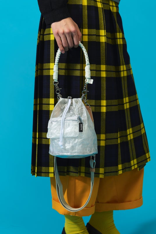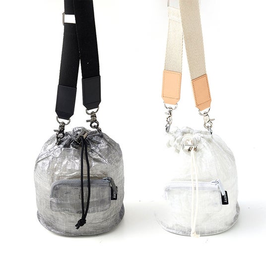 巾着×Dyneema(R)の組み合わせが新しいショルダーバッグは、フロントポケットが取外し可能。