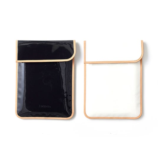 新たに登場のスリーブケースは、14インチまでのPCやタブレットを収納可能。内側のキルティング加工により、衝撃を和らげるクッション性を実現。外側はPVCにレザーのパイピングの異素材使用で高級感を演出。デバイス以外のステーショナリー等もスッキリ収納。面ファスナー部分の刺繍ロゴがワンポイント。