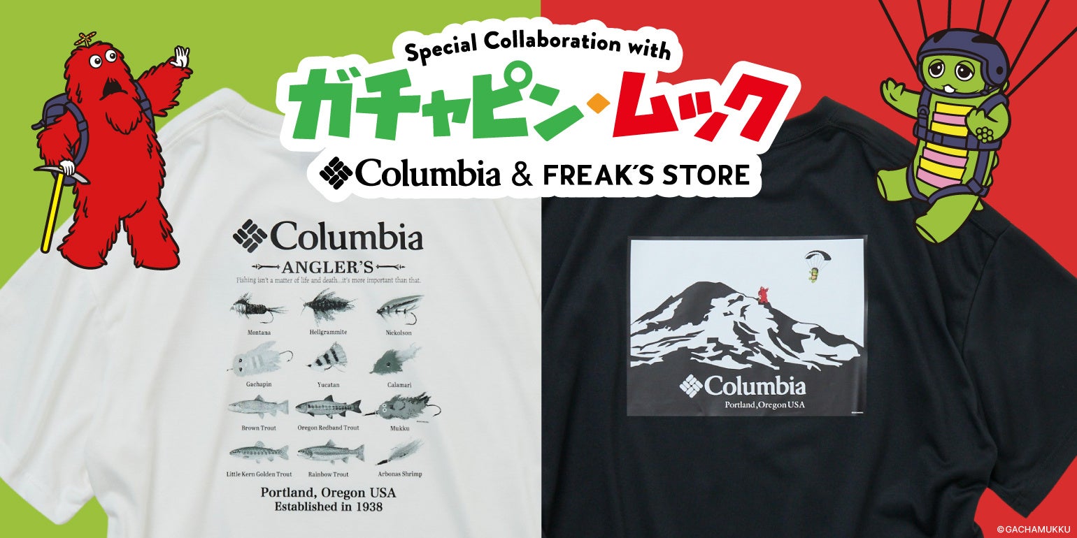 ガチャピン・ムックがColumbia×FREAK’S STOREとのトリプルコラボレーションTシャツとして登場!ルアー柄に潜む姿や、アウトドアを楽しむ、愛らしいデザインが魅力のアイテムです!