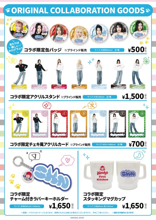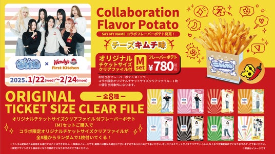 ウェンディーズ・ジャパン株式会社及び、ファーストキッチン株式会社(所在地:東京都新宿区、代表取締役:紫関修)は1月22日(水)より、ウェンディーズ・ ファーストキッチンとファーストキッチン(競馬場店を除く)で、日韓で活躍するJAEJOONG(ジェジュン)がプロデュースする7人組のガールズグループ『SAY MY NAME』(セイマイネーム)とのコラボキャンペーンを開催します。コラボを記念して、フレーバーポテト「チーズキムチ味」を販売します。さらに『SAY MY NAME』各メンバーを撮り下ろしした、オリジナルチケットサイズクリアファイル(全8種)とお好きなフレーバーポテトMセット780円(税込)を2月24日(月)までの期間中、数量限定で販売します。数に限りがありますのでお早めにご来店ください。また、4店舗限定で店内装飾を実施します。ぜひ『SAY MY NAME』の世界観をお楽しみください。
