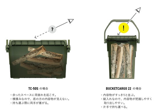 長い道具の収納と運搬が可能なマルチに使えるバケツ型収納容器が新登場。バケツとしての用途はもちろん、薪などの長い道具を立てて収納ができ、取り出しがしやすくなります。