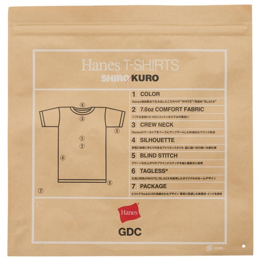 今回のこのプレミアムベーシックモデルは、 「Hanes T-SHIRTS SHIRO(R) 」と、「Hanes T-SHIRTS KURO(R) 」を各1枚ずつアソートでパッキング。ボディと同色のロゴ、ウイングモチーフ、GDCのシンボルマークであるSTAモチーフを刺繍したスペシャルなデザインに仕上がっています。