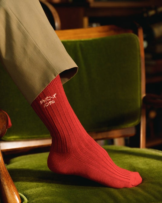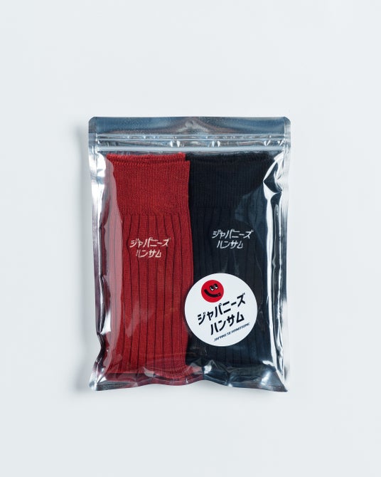 【コラボ商品について】今回のコラボ企画は、普段からタビオの赤い靴下を愛用されている西野亮廣さんとのご縁から生まれました。商品は、西野さんのInstagramアカウント名“japanesehandsome”をデザインのモチーフにし、「ジャパニーズハンサム」の文字を4×2リブソックスに刺繍で表現したものです。赤と黒の2足セットとなっています。