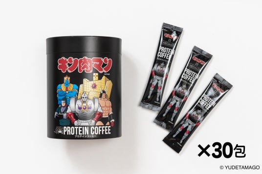 今回、キン肉マン特別パッケージ「悪魔超人Ver.」の PROTEIN COFFEE 30包入りタイプのほか、キン肉マン「KINマーク」デザインのタンクトップ(ブラック)入りの限定版10包入りタイプも数量限定にて展開します。