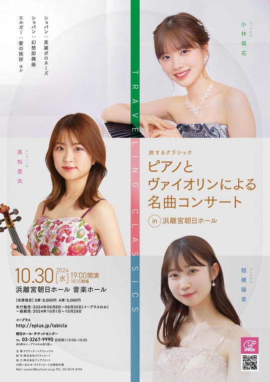 2024年10月30日(水)に開催予定の『旅するクラシック「ピアノとヴァイオリンによる名曲コンサート」 in 浜離宮朝日ホール』と題した本公演は、次世代を担う一流クラシックアーティストであるピアニスト稲積陽菜・ヴァイオリニスト高松亜衣・BEYOOOOONDS・SeasoningS所属の小林萌花をピアニスト兼案内人に迎え、開催することが決定しました!