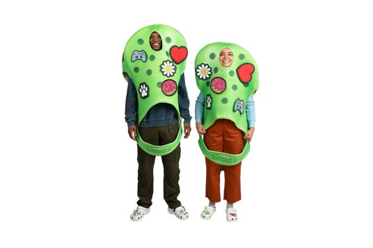 「クロックス クラシック コスチューム」は、クラシック クロッグをかたどった等身大のコスチュームです。ジビッツ(TM) チャームでデコレーションされたクロッグをイメージしており、実際のフットウェアのように、このコスチュームにも右足用と左足用のバージョンがあります。クラシック クロッグの特徴的な穴に腕を通す仕様になっており、着用者の顔がジビッツ(TM) チャームとして機能するなど、ユニークなコスチュームはハロウィーンアイテムにもぴったりです。