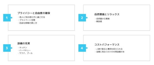 宿泊施設を選ぶ際、ゲストは「プライバシー」「自然環境」「設備」「コストパフォーマンス」の4つを重視しており、貸別荘のオーナーとしては押さえておきたいポイントといえます。特にバーベキュー設備やサウナは、ある程度の予算と空きスペースがあれば導入できるので、ハードルはそこまで高くないのかもしれません。