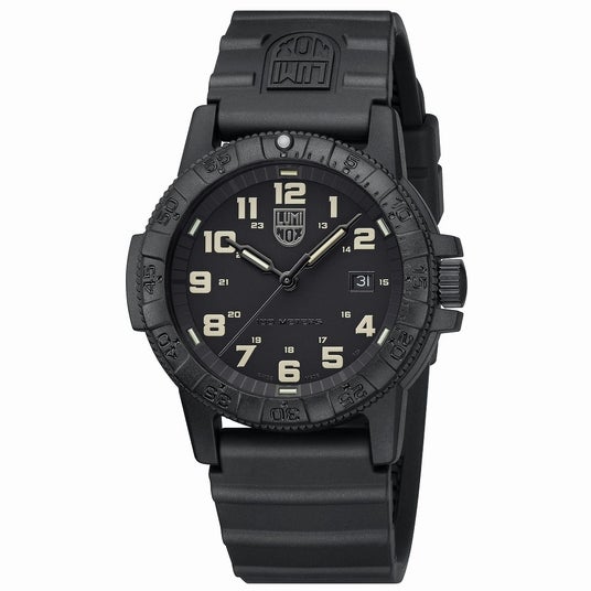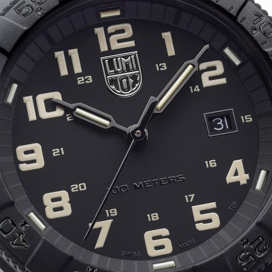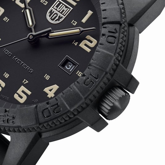 今回の新作は、ブラックを基調とし、文字盤インデックスをサンドカラーにすることで印象的なコントラストを生み出し、ルミノックスの典型的な頑丈なデザインを実現しています。