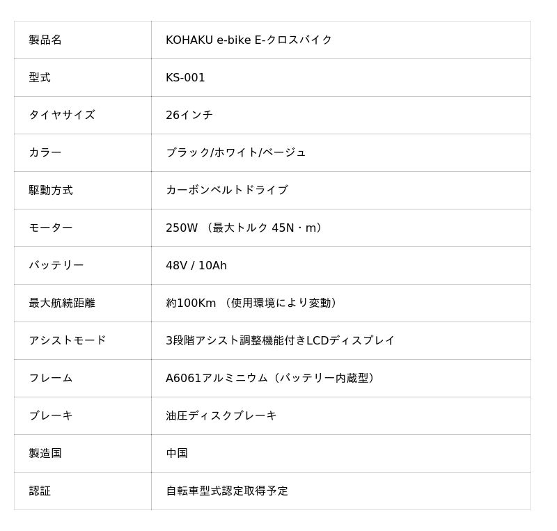 ◯ KOHAKU e-bike E-クロスバイク KS-001 の特徴