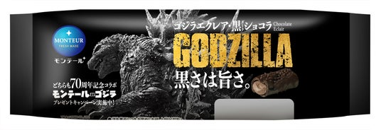 「黒く」そして通常のエクレア生地よりも「大きく」焼き上げた生地に、ホイップクリームとコラボ専用のブラックココアカスタードを加えたこだわりのチョコクリームをつめ、チョコでコーティングしました。さらに、ゴジラを彷彿とさせるような、ゴツゴツとしたチョコチップをトッピング。濃厚でなめらかなチョコの味わいと、チョコチップの食感が楽しめます。