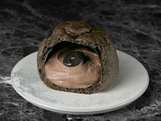自家製の低温殺菌牛乳、ブラックココアやベルギー産チョコレートを使用し、銅釜で丁寧に炊き上げた、このコラボ専用のブラックココアカスタードとなめらかなチョコクリームの2層仕立て。「黒く」そして通常のシュー生地よりも「大きく」焼き上げたオリジナルの黒い生地につめました。濃厚で、ビターなチョコの味わいをたっぷりと楽しめます。
