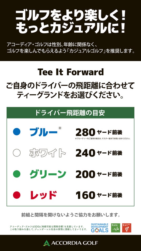 株式会社アコーディア・ゴルフ(本社:東京都品川区、代表取締役社長CEO石井 歓、以下「当社」)は、これまで推進してきたカジュアルゴルフを更に浸透させるために、老若男女に関わらず、経験年数、ブランクの有無、プレー時間の短縮など、さまざまなニーズに応じて、幅広くゴルフを楽しんでいただくため「Tee IT Forward」の考え方に基づき、「ジェンダーレスティー」を当社運営の全てのゴルフ場で導入します。