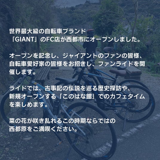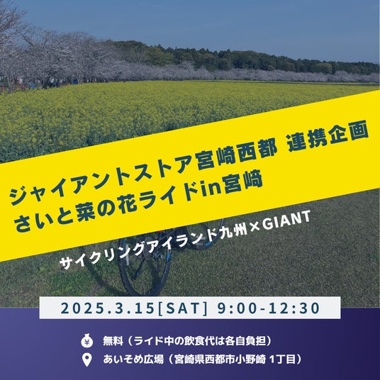 世界最大級の自転車ブランド「GIANT」の新店舗が宮崎県西都市にオープン!オープンを記念し、ジャイアントファンや自転車愛好家とともに、歴史探訪とカフェタイムを楽しむ特別なファンライドを実施します。菜の花が咲き誇る西都原で、春の訪れを感じながらライドをお楽しみください。電動アシスト付き自転車のレンタサイクルを無料でご用意しております。サイクリング初心者の方やファミリーでもご参加ください。