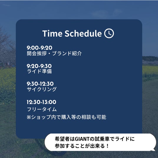 12:30 フリータイム(試乗車体験やジャイアントストアさんへの相談など)