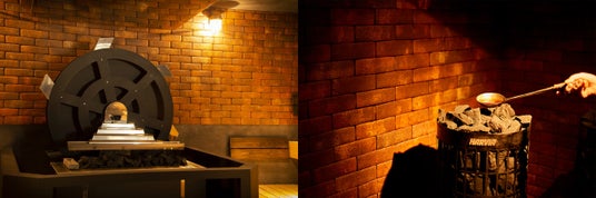 HARE-TABI SAUNA & INN サウナストーブ/写真 左:水車(男性)、右:煙突(女性)中国茶ロウリュ