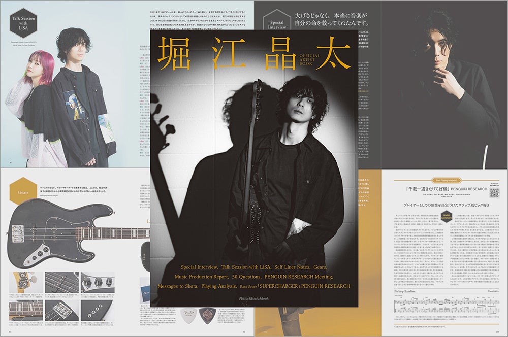 また、マルチ・インストゥルメンタリストである堀江氏が愛用するベース、ギター、キーボードなどの使用機材や楽曲が生まれる現場であるプライベート・スタジオの紹介記事、雑誌『ベース・マガジン』に掲載されたインタビュー記事や奏法解説記事の再掲、PENGUIN RESEARCHの「SUPERCHARGER」のベース・スコアも収録し、クリエイター/プレイヤーとしてのコアな部分もフィーチャーしています。