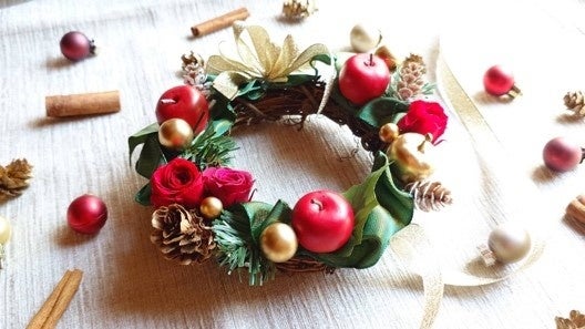 「プリザーブドフラワーとリボンやクリスマスオーナメントを使用したリース作り」