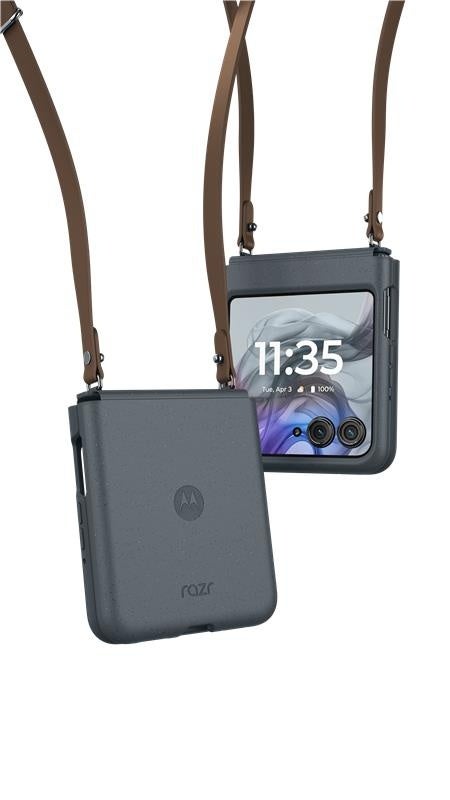 「motorola razr 50d M-51E」の発売に併せ、初のモトローラ製純正スマートフォン専用ケースを発売いたします。持ち運びに便利なショルダーストラップを付属した「Premium Case」は、環境に配慮したヴィーガンレザーを使用。NTTドコモ限定で取扱いいたします。