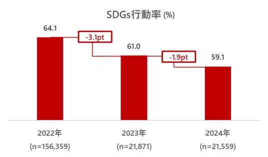 SDGsの認知率は79.1%となり、前年(80.5%)から1.4ポイント低下した。また、SDGsに関する行動をしていると回答した、SDGs行動率は59.1%となり、前年(61.0%)から1.9ポイント低下した。2022年から3年分を比較すると低下傾向が見られ、2022年から5.0ポイントの低下となった。