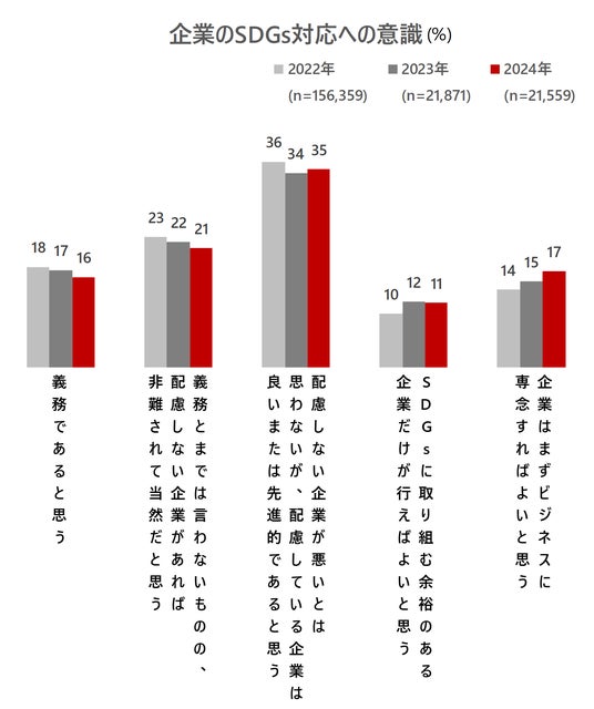 企業がSDGsに対応することへの意識について、トップは3年連続で「配慮しない企業が悪いとは思わないが、配慮している企業は良いまたは先進的であると思う」となった。