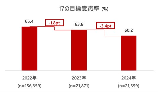 現在行っている行動において、意識しているSDGsの17の目標を聴取した。17の目標のいずれかを回答した、SDGsの17の目標意識率は60.2%となり、前年(63.6%)から3.4ポイント低下した。2022年から3年分を比較すると低下傾向が見られ、2022年から5.2ポイントの低下となった。