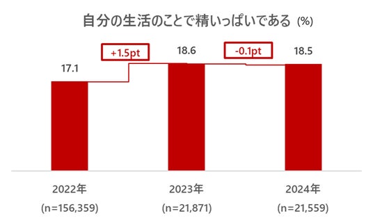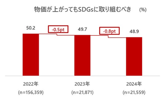 生活のゆとり具合について、自分の生活のことで精いっぱいであると感じているのは前年と同水準の18.5%だが、2022年と比べると1.4ポイント上昇した。また、物価が上がってもSDGsに取り組むべきと回答した割合は48.9%となった。2022年から3年分の比較で見ると低下傾向が見られ、2022年から1.3ポイント低下している。