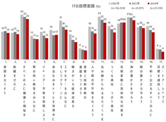 また、同設問において意識して行動していると回答されたSDGsの17の各目標を見ると、前年同様に「3.すべての人に健康と福祉を」が最も高く22%だった。次いで「14.海の豊かさを守ろう」が21%、「11.住み続けられるまちづくりを」「13.気候変動に具体的な対策を」が同率で20%だった。2022年から3年分を比較すると、全般的に低下傾向が見られる。しかし、「13.気候変動に具体的な対策を」は前年と同水準を保っている。近年の豪雨や豪雪、平均気温の上昇など、温暖化を実感する経験が影響していると考えられる。