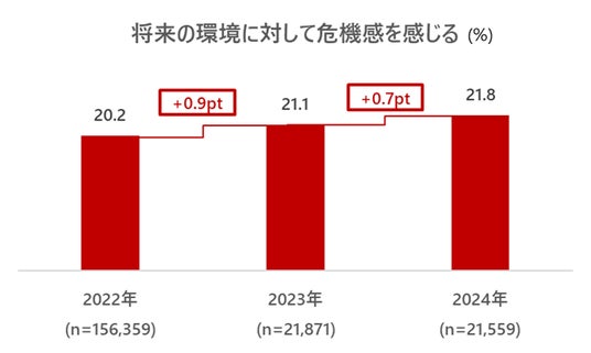将来の環境に対して危機感を感じると回答した割合は21.8%となった。2022年から3年分を比較すると上昇傾向が見られ、2022年から1.6ポイント上昇した。