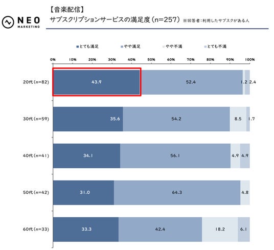 50代も95.2%とほぼ同等の満足度でしたが、最もポジティブな「とても満足」の回答割合で比較すると、やはり20代が43.9%でダントツのトップです。