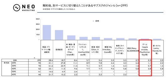 一方、同じくエンタメコンテンツの一つである「ゲーム」は、全体の2.3%にとどまった。各サービスの独自性が強いのか、ゲームの場合、他のサービスにスイッチするために辞めるというケースは比較的少ないようだ。