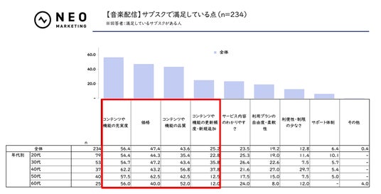 特に注目なのが、両ジャンルとも「価格」への満足度が、サブスクの継続利用を促すカギとなる項目「コンテンツや機能の更新頻度・新規追加」を抑え、50%前後に上っている点。