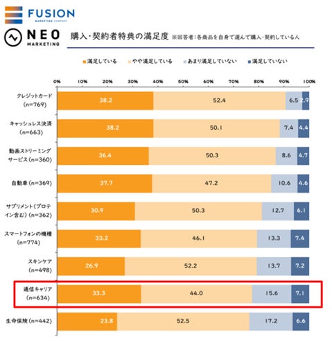 前掲した設問【購入・契約者特典の活用状況】で「通信キャリア」は、特典活用率50.6%で「クレジットカード」「キャッシュレス決済」に次いで3番手となっていました。しかし満足度となると、77.3%(※)で8番手に転落しています。
