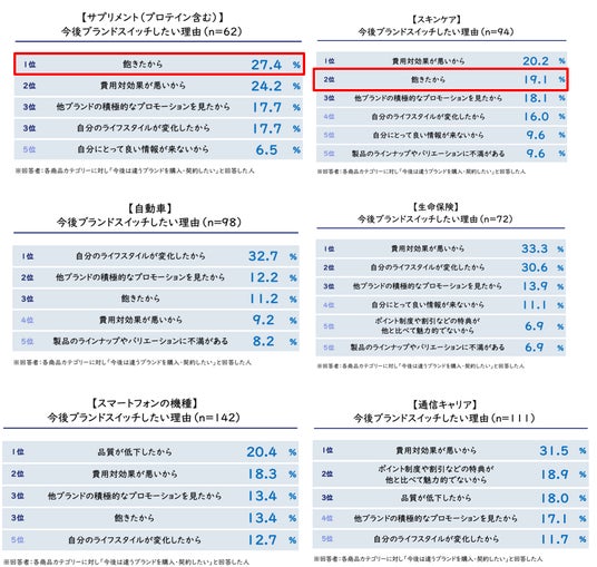 一方で、「サプリメント(プロテイン含む)」「スキンケア」は「飽きたから」がスイッチ理由として多い傾向にありました。