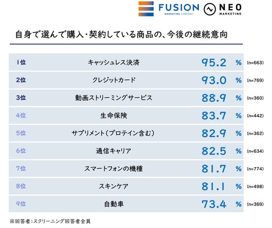 同じく決済サービスの「クレジットカード」も、93.0%で2位にランクイン。一方で、「サプリメント(プロテイン含む)」「スキンケア」「自動車」といった有形商材の継続意向は比較的低くなっていた。