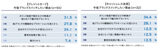 前掲した設問【自身で選んで購入・契約している商品の、今後の継続意向】で上位2位を占めた「キャッシュレス決済」と「クレジットカード」は、いずれも「ポイント制度や割引などの特典が他と比べて魅力的でないから」「他ブランドの積極的なプロモーションを見たから」「自分のライフスタイルが変化したから」がTOP3に。