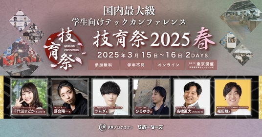 株式会社CARTA HOLDINGSのグループ会社で、国内最大級のエンジニア学生のデータベースを保有する株式会社サポーターズ(東京都港区、代表取締役:楓 博光、以下「サポーターズ」)は、エンジニア学生向けテックカンファレンス「技育祭2025【春】」を、2025年3月15日(土)・16日(日)にオンラインおよび東京会場にて開催いたします。本イベントでは、エンジニアを志望する学生を対象に、国内外のIT業界をリードするゲストによる講演などを行います。技育祭は毎年、春と秋の2回開催され、約4,000人の学生が参加しています。