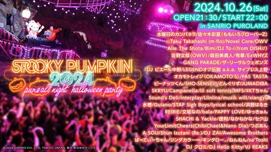 株式会社サンリオエンターテイメント(本社:東京都多摩市、代表取締役社長:小巻亜矢)が運営するサンリオピューロランド (以下、ピューロランド)は、音楽事務所「株式会社メロディフェア」(以下、メロディフェア)とタッグをを組み、10月26日(土)に一夜限りのオールナイトハロウィーンパーティ「SPOOKY PUMPKIN 2024 ~PURO ALL NIGHT HALLOWEEN PARTY~」を開催します。