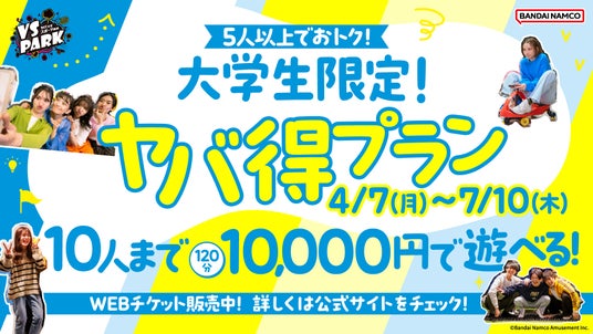 株式会社バンダイナムコアミューズメントは、全国の屋内“ヤバすぎ”アクティビティ施設『VS PARK』にて、2025年4月7日(月)から7月10日(木)まで、大学生限定のお得な料金パック「大学生限定!ヤバ得プラン」を販売します。