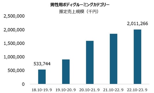 男性の美意識の高まりにより、年齢を問わず、男性のボディグルーミングへの関心が高まっています。男性のボディグルーミング市場は5年前と比較して金額規模で約4倍伸長し、2023年9月時点で、約20億円にまで成長しています。