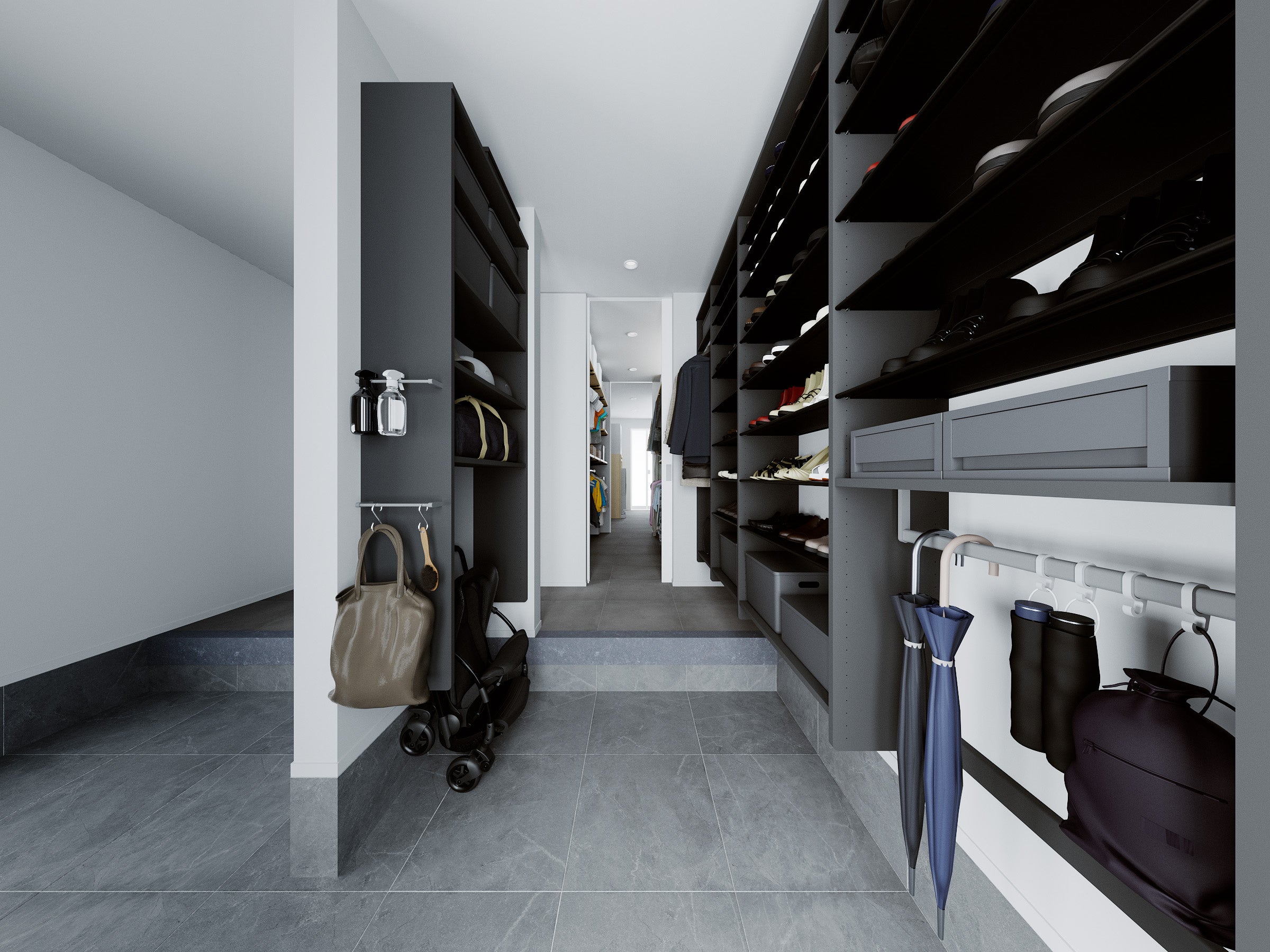 玄関をもっとスタイリッシュに、機能的に。ダークグレー色のII型シューズクローク。