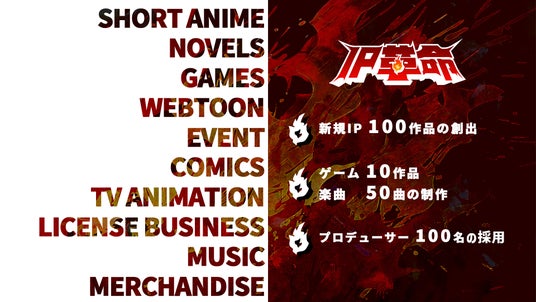 このたび調達した資金は、「日常に温度を。世界に熱狂を。時代に灯火を。」の実現に向け、2年間でIP100作品、新規事業の創出と、それに伴う採用活動に積極的に投資いたします。