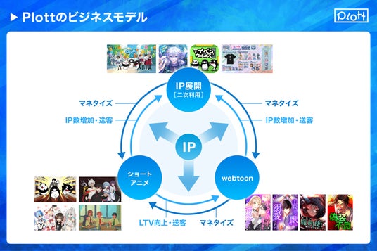 PlottはSNSにおけるショートアニメ作品とwebtoon(※)作品のプロデュース、自社IPを用いたゲーム、音楽、グッズなどのビジネス展開を行っています。直近では、さまざまなチャネルを通じてファンとの接点の拡大を目指し、自社内でのメディアミックスに注力しています。