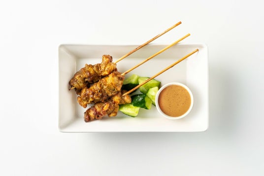 香辛料でマリネした鶏肉を、香ばしくこんがりと焼き上げた一口サイズの串焼き。濃厚でコクのあるピーナッツソースにつけてお召し上がりください。添えられたキュウリもソースにつけてどうぞ。